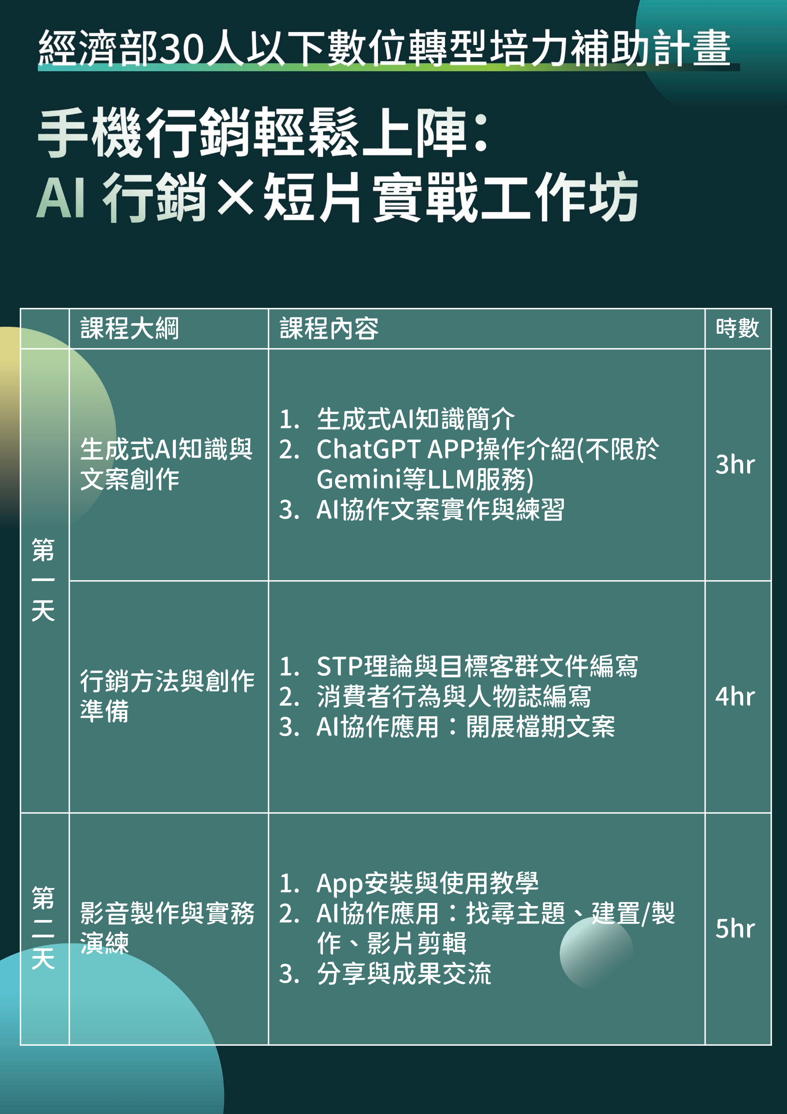 本課程旨在讓學員掌握生成式 AI 工具的應用技巧,結合行銷策略思維與影音製作能力,從文案創作、受眾分析、到影音實作,建立一套可實際操作的數位行銷內容製作流程。透過實作導向的教學,協助學員快速提升行銷創意產能與數位內容操作力。