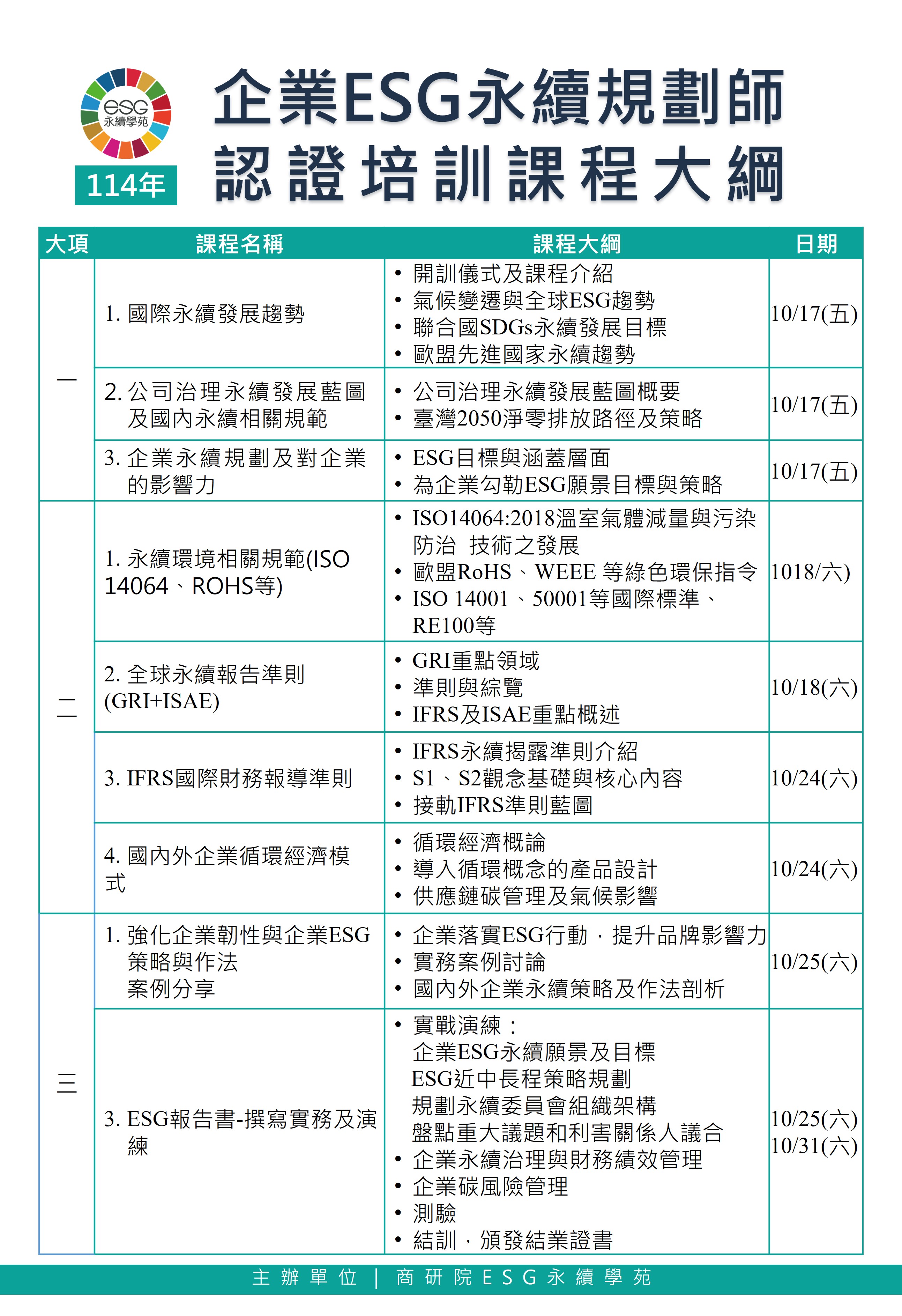 2. 企業ESG永續規劃師提供國際知名機構認證:全勤或出席率需達7成(達24小時)得報考認證,須另付費(新台幣3,000元)進行線上考試,測驗通過(達80分以上)後即可獲得。